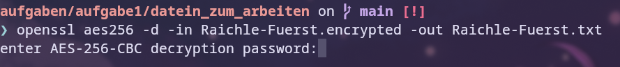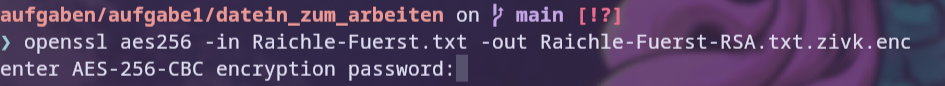 To encrypt the file with AES256 in this case, aes256 is used as an argument and the -in/-out flags specify the input/output file. After entering the command, a password must be entered.