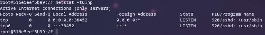 Running the same command on the container now shows that the sshd process is listening on the desired port. The d