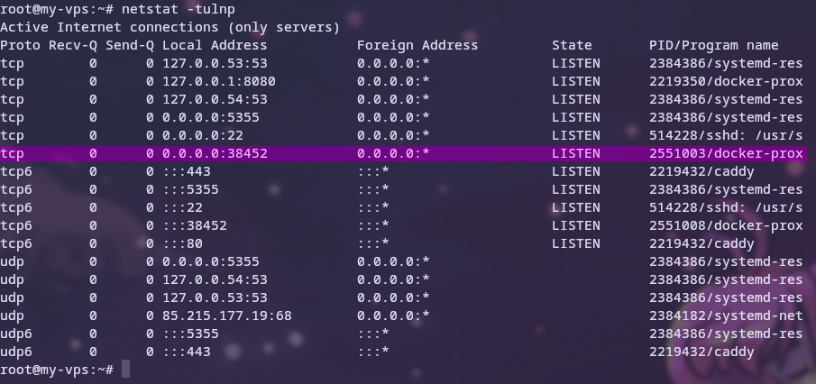 When I run this command on the host, it only shows the docker process instead of ssh directly, because ssh is running inside the container. There are also other containers and processes listening as I use this VPS to host SearXng as well.