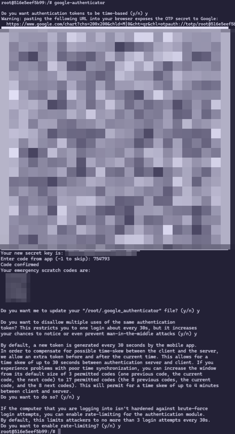 command, scan the QR code with the 2FA app of your choice and reply to each prompt with y