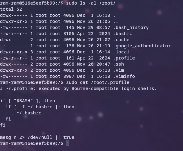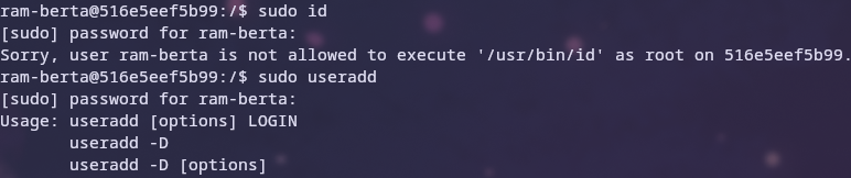 RUN echo "ram-ram ALL=(root) /bin/ls" >> /etc/sudoers